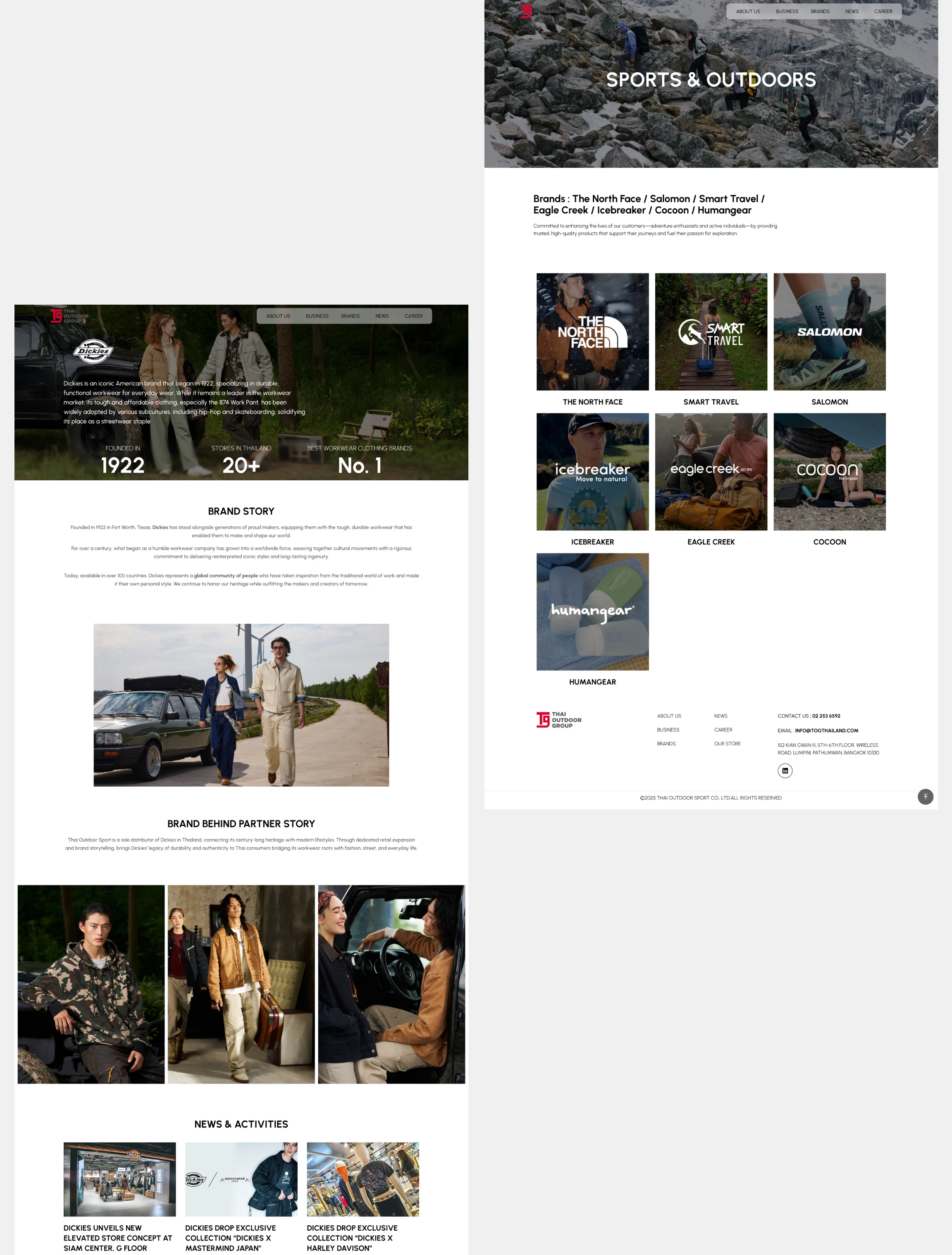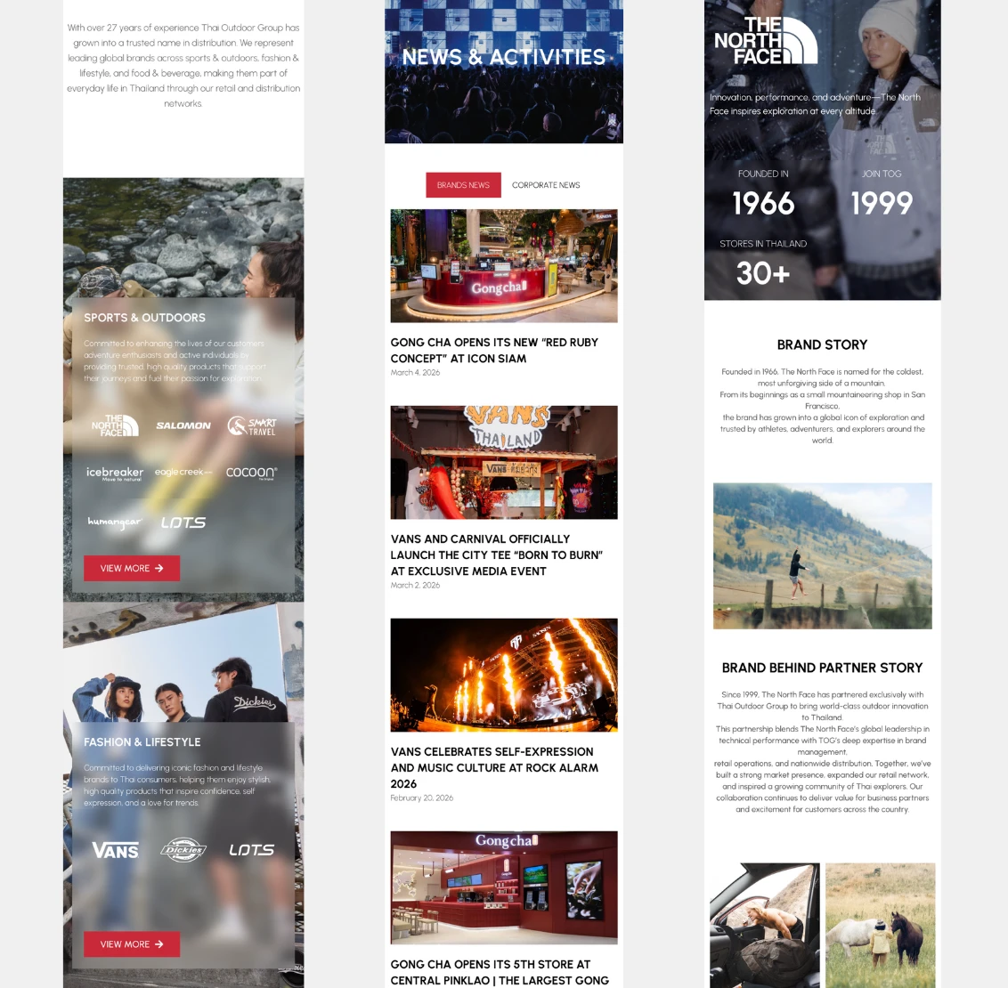 Thai Outdoor Group (TOG) is a leading distributor that transforms global brands in sports, fashion, lifestyle, and food & beverage into cultural inspiration in Thailand. Our role was to design and develop their official corporate website, creating a premium digital space to seamlessly showcase their diverse portfolio of world-renowned brands—including The North Face, Vans, Salomon, Dickies, and Gong Cha—while reflecting their vision of connecting people with inspiring experiences.